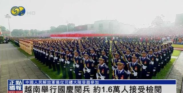 当地时间9月2日上午,越南首都河内举行纪念八月革命暨越南国庆80周年阅兵活动,越南军队、公安、民兵等部门的一万六千多人参加了检阅,越南空军的30多架战斗机和直升机编队也接受了检阅。中国人民仪仗司礼大队受邀参加了此次阅兵,中国军人整齐的步伐和昂扬的军姿赢得了当地民众的喝彩。同时受邀参加阅兵的还有俄罗斯、柬埔寨、古巴、老挝和白俄罗斯等国的部队。
