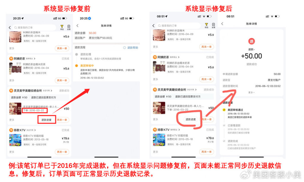 根据美团的说法,所谓的“退款未到账”并不存在,而是技术更新和升级未到位,导致无法及时更新退款最新情况。但根据用户的集体反馈,大量2014-2016年的历史订单均出现退款不成功状态。此外有多位用户对美团的解释提出质疑称,已查询银行流水,仅有部分订单显示已有退款。