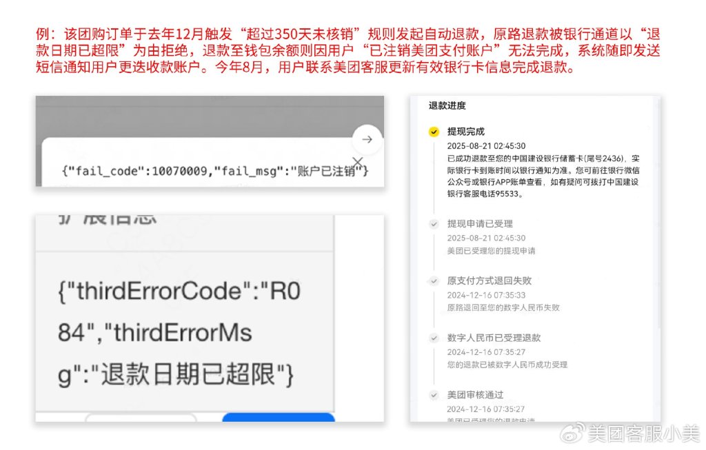 但极端情况下,如果用户“钱包余额”状态异常、功能受限,或注销了相关账户,系统自动退款时,也无法直接退到“钱包余额”。此类订单,用户可以操作退款到新的指定银行卡,或联系客服协助处理。美团也在持续通过短信等方式,提醒相关用户接收退款。