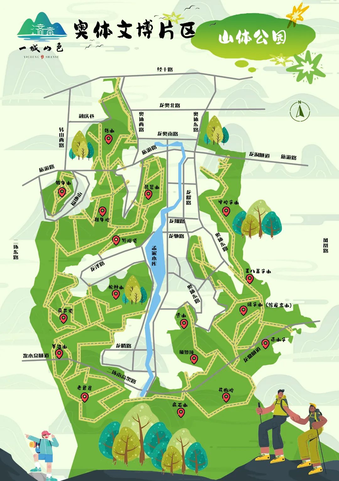 奥体文博片区山林绿道全长约80公里,串联了历下区龙鼎大道东、西两侧的转山、赶牛岭、野峪顶、东山、葫芦顶、半边山、老君崖、扁石山、花椒岭、簸箩顶、雪山、绿子山、锦屏东山、王八盖子山、牧牛山等山体,以及大辛河、孟家水库沿岸。沿线栽植了元宝枫、黄栌、迎春、连翘等适生苗木,设置了休憩广场、健身步道、观景平台等设施,完善了驿站、标识牌、座椅等配套服务设施。