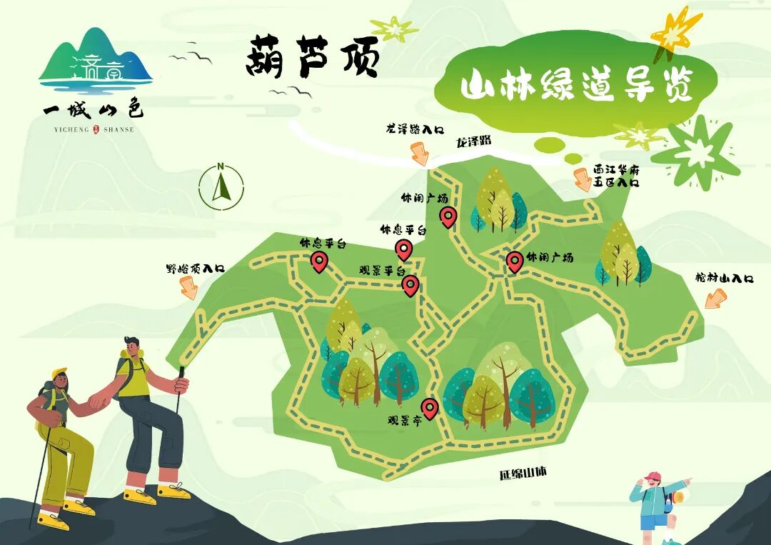 全长1.2公里,沿线设置了供市民休憩的凉亭、观景平台、休闲座椅,山上落叶植物、常绿植物、开花植物、色叶植物相间种植,市民可在鸟语花香的环境中休闲健身、登高远眺。