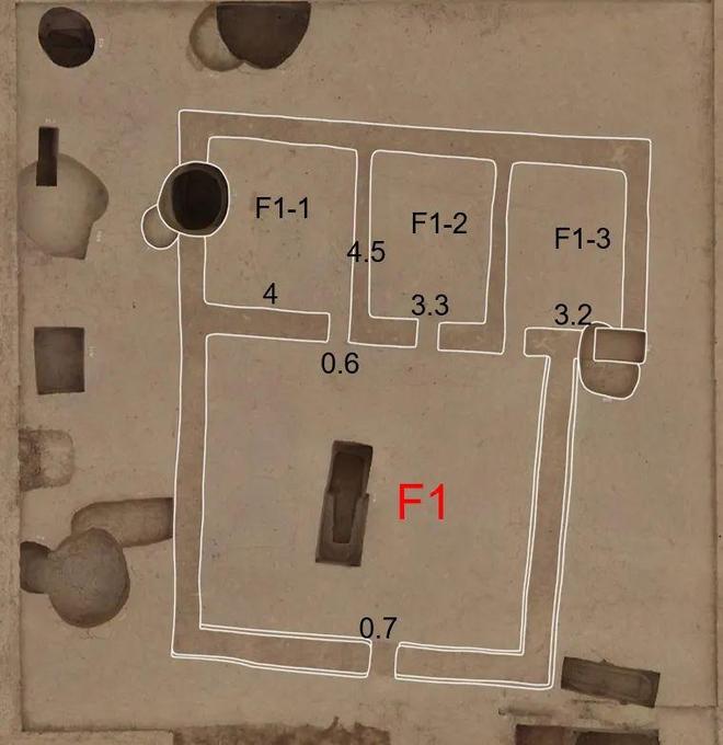 上图为郑州市文物考古研究院考古人员在对岗崔遗址发掘中,发现一座标记为F1的院落遗存。